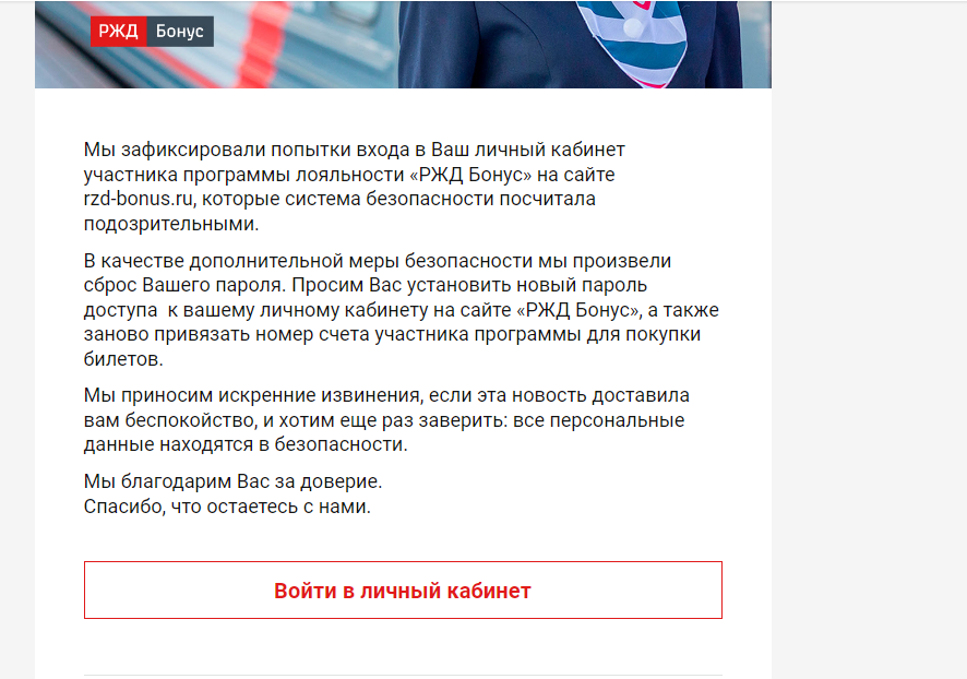 " Мы зафиксировали попытки входа в Ваш личный кабинет участника программы лояльности «РЖД Бонус» на сайте rzd-bonus.ru, которые система безопасности посчитала подозрительными. В качестве дополнительной меры безопасности мы произвели сброс Вашего пароля. Просим Вас установить новый пароль доступа к вашему личному кабинету на сайте «РЖД Бонус», а также заново привязать номер счета участника программы для покупки билетов. Мы приносим искренние извинения, если эта новость доставила вам беспокойство, и хотим еще раз заверить: все персональные данные находятся в безопасности. Мы благодарим Вас за доверие. Спасибо, что остаетесь с нами."