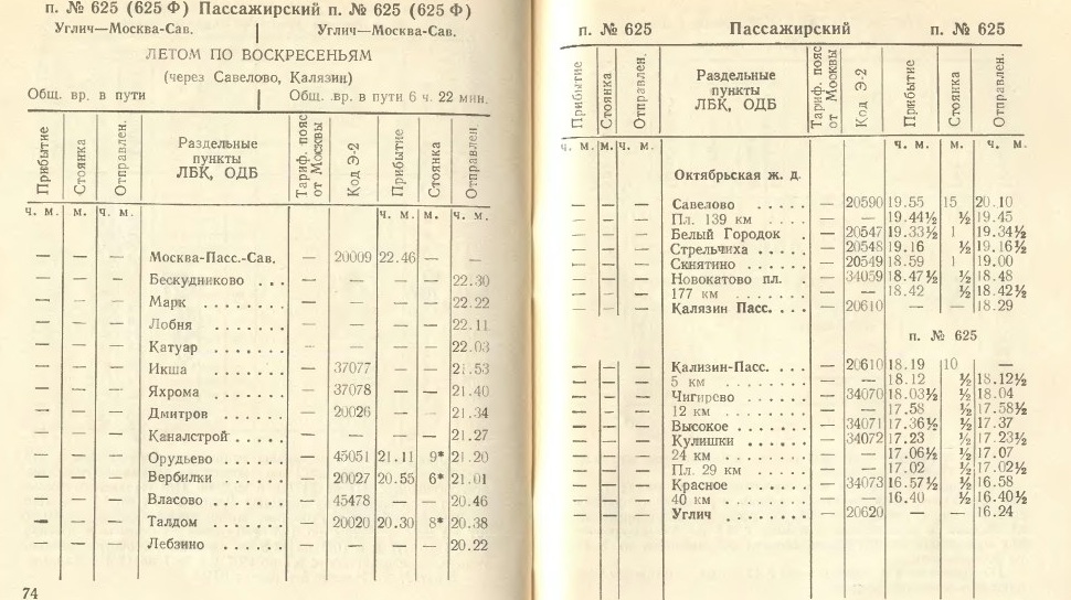 1991 год служебное расписание поезда № 625Ф Углич-Москва