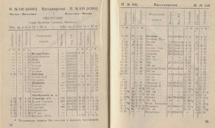1994 год служебное расписание поезда № 640 О/639 О Москва-Весьегонск