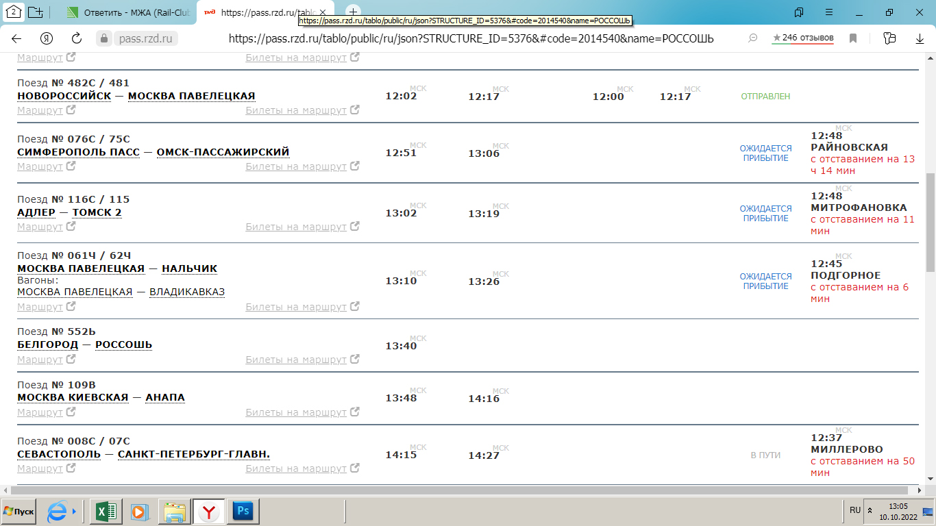 Только что забила "Россошь" (где он сейчас должен находиться в соответствии с графиком на данный рейс) - показал, что в 12:48 проследовал Райновскую "с отставанием на 13 ч 14 мин" (насколько понимаю, это - относительно стандартного графика).