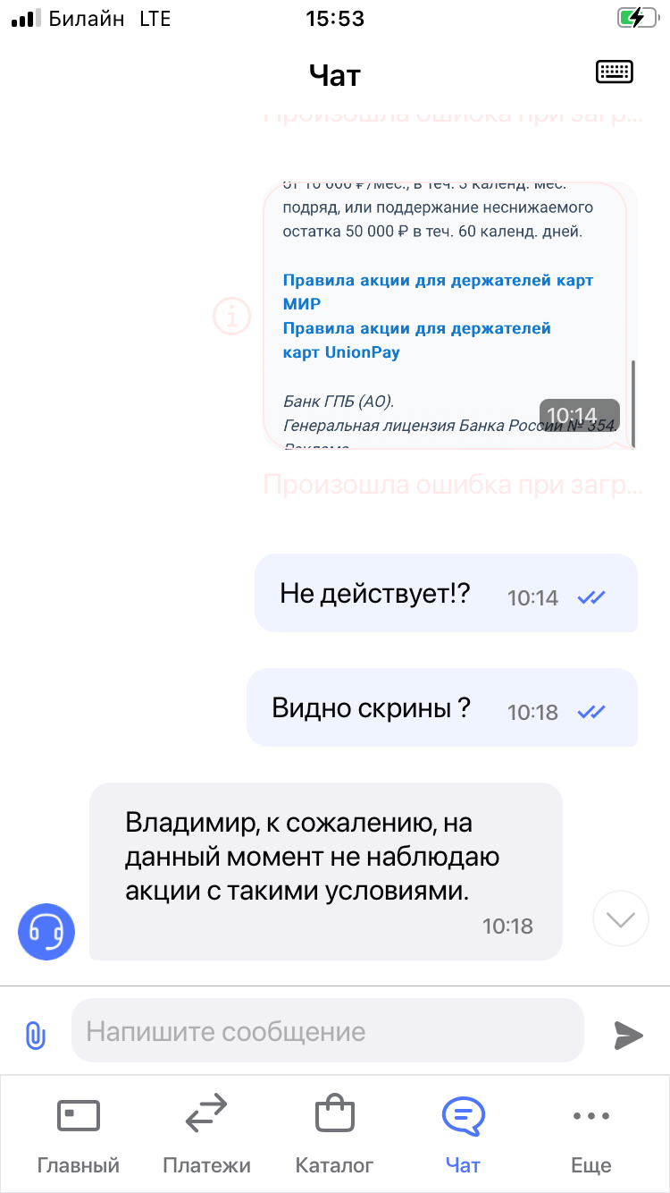 Пипец. Поддержка ничего не знает. Скоро клиенты будут рассказывать ГПБ какие и где у него идут акции.