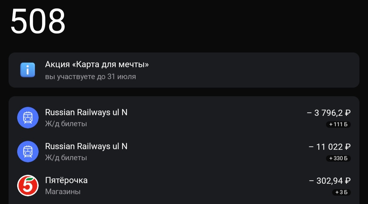 И я потратил на ж/д и супермаркеты, даже 22 тысячи руб. Дали 508 бонусов (из расчёта 3%) – и всё.