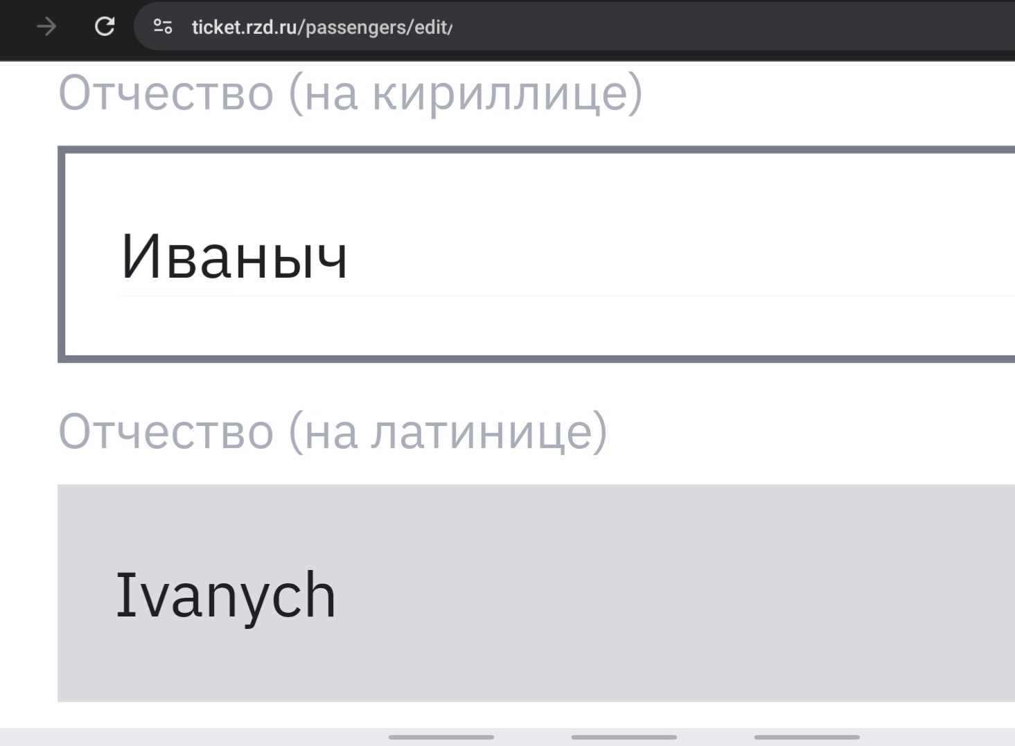 Как на дурацком сайте РЖД исправить отчество латиницей в загранпаспорте? Там поле серое, редактировать нельзя, в итоге не дает купить билет с указанием бонусной карты.