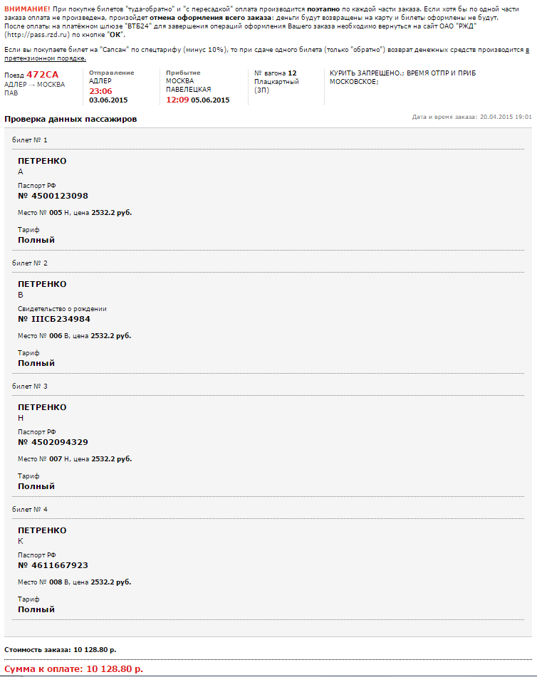 Пытаюсь заказать билеты на четверых на сайте РЖД (плацкартный вагон Адлер-Москва на 2-3 июня, если это важно),