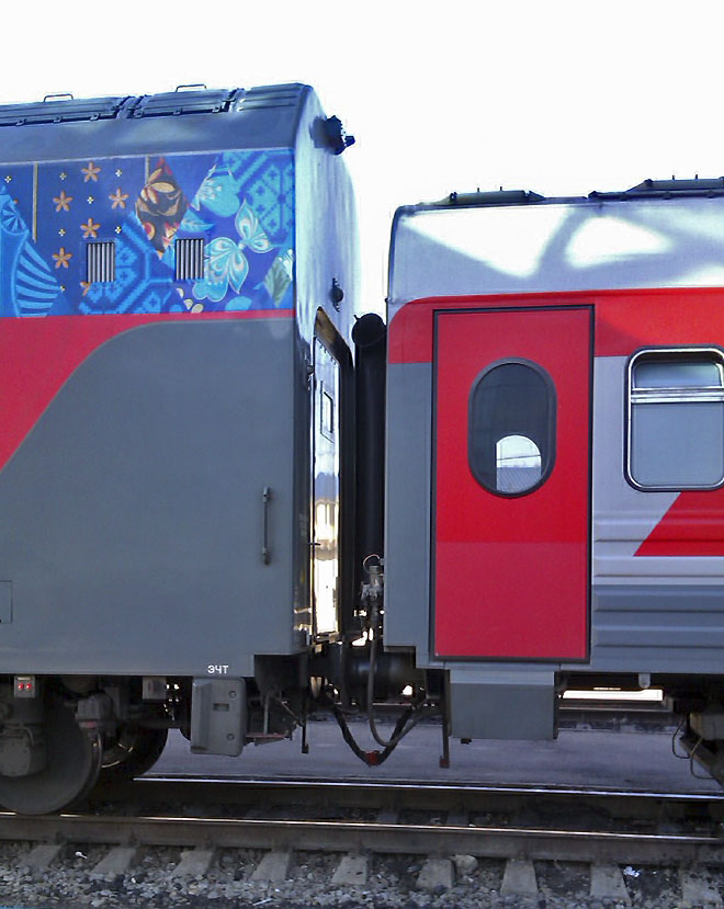В другом составе только один вагон новый, другие - старые с рисунками к олимпиаде.