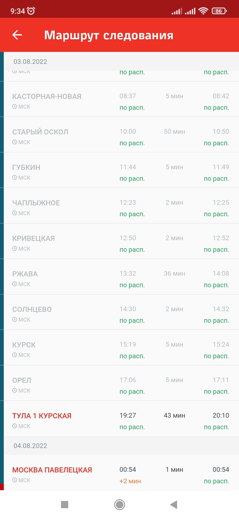 Точно, спасибо за разъяснение!af1461: Там так получилось, что в одни сутки на Павелецкий вокзал прибывают два поезда 214Й из Кисловодска. Один отправлением из Кисловодска 02.08 и идущий через Старый Оскол прибыл в 00:54 04.08, второй отправлением из Кисловодска 03.08 и идущий через Щигры прибудет в 22:22. В итоге расписанию немного снесло крышу. Поправят )