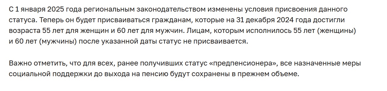 serg: Вы это серьезно? В Москве с 01 января этого года Постановлением Собянина от 28 декабря 2024 - статус предпенсионное с 55 лет для женщин и с 55 лет для мужчин - отменили.