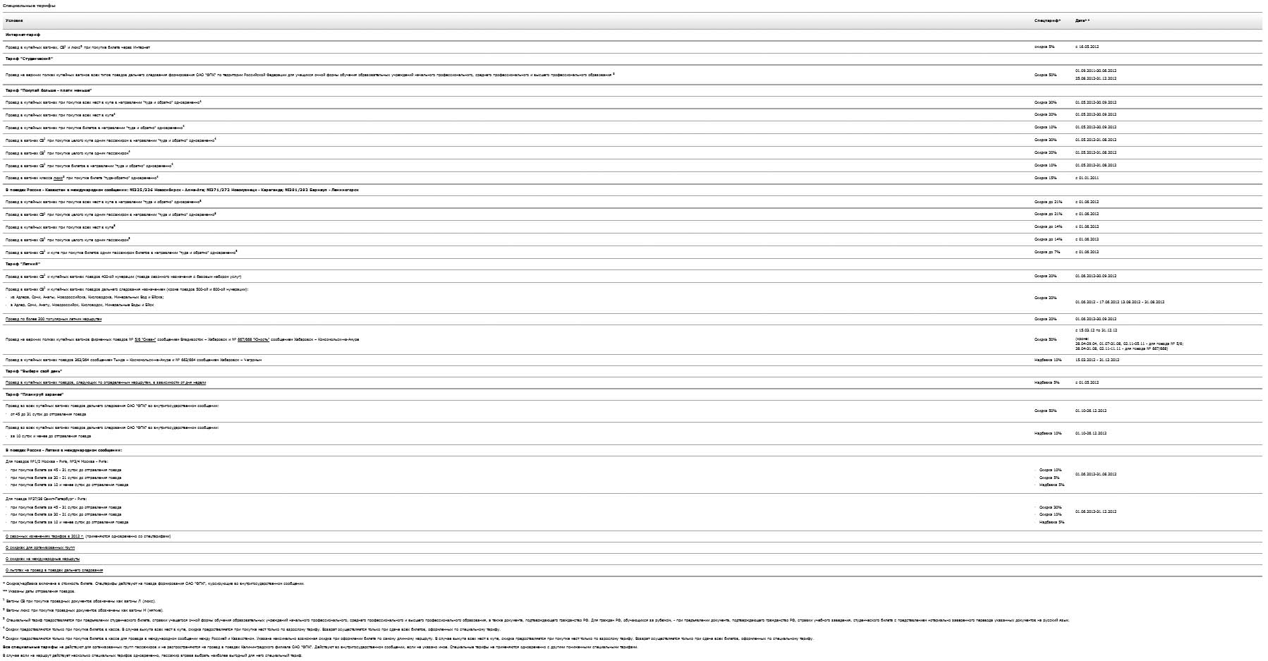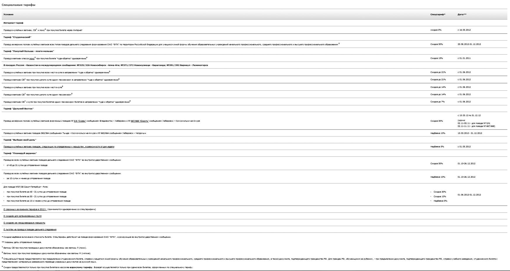 * Скидка/надбавка включена в стоимость билета. Спецтарифы действуют на поезда формирования ОАО "ФПК", курсирующие во внутригосударственном сообщении.