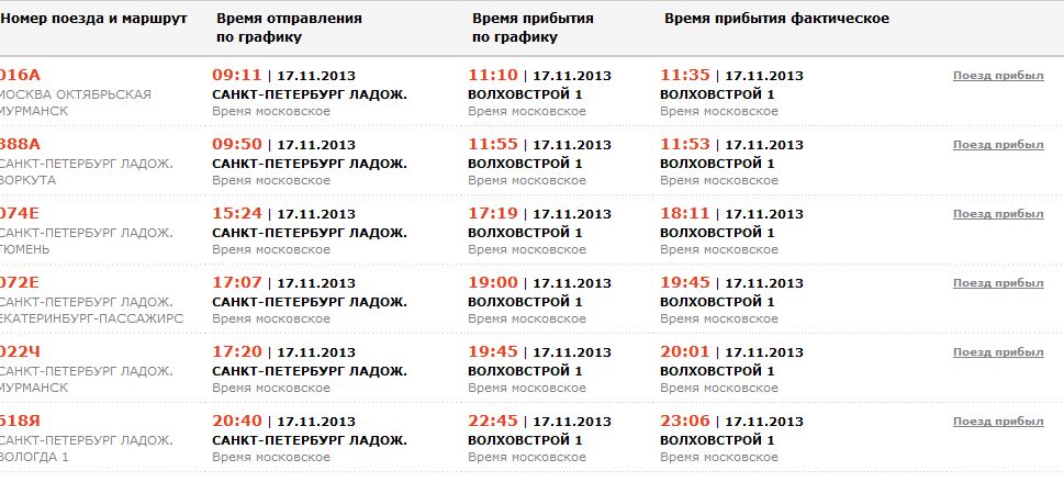Сегодня ехал в поезде Петербург - Вологда, который опоздал по прибытии. Пассажиры говорят, что последние дни это - нередкость. Посмотрел - другие поезда тоже шли с опозданием. Вбил фактическое движение поездов за вчера и сегодня и увидел, что опоздания носят системный характер. К сожалению, за прошлые дни не посмотреть.