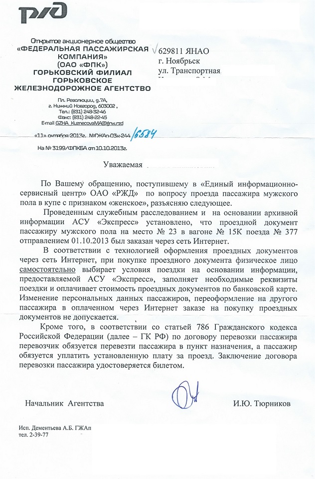 Может и не надо было новую тему открывать,но,ИМХО,ситуация о которой мне рассказали и подтвердили документами,непонятна. Итак,был куплен билет в женское купе. Скан билета прилагается. По дороге в купе садится мужчина,который купил билет через интернет. На возражения проводник ответил,что покупка через интернет не гарантирует соблюдение по половому признаку. Ответ на жалоба в Горьковский филиал подтверждает правомочность действий проводника. Выходит,что все эти признаки "М" и "Ж" фикция?