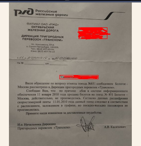 Тем не менее, примерно в 6-30 утра 11 января на вокзале в Твери прозвучало объявление о прибытии «электропоезда повышенной комфортности 851 Бологое Москва». Кассиры повторили информацию о том что «продать они билет не могут, так как поезда в системе нет» / «он отменен», а по поводу объявления о прибытии начали совещание между собой.