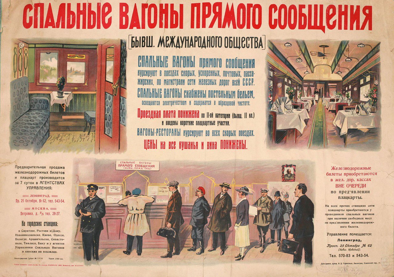 «Спальные вагоны прямого сообщения (бывш. международного общества). Спальные вагоны снабжены постельным бельем, освещаются электричеством и содержатся в образцовой чистоте. Проездная плата понижена по II-ой категории (бывш. II кл). Цены на все кушанья и вина понижены».