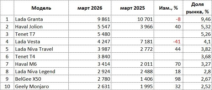 В марте 2026 года в России продано 104 278 новых легковых автомобилей, что на 30% больше, чем год назад.