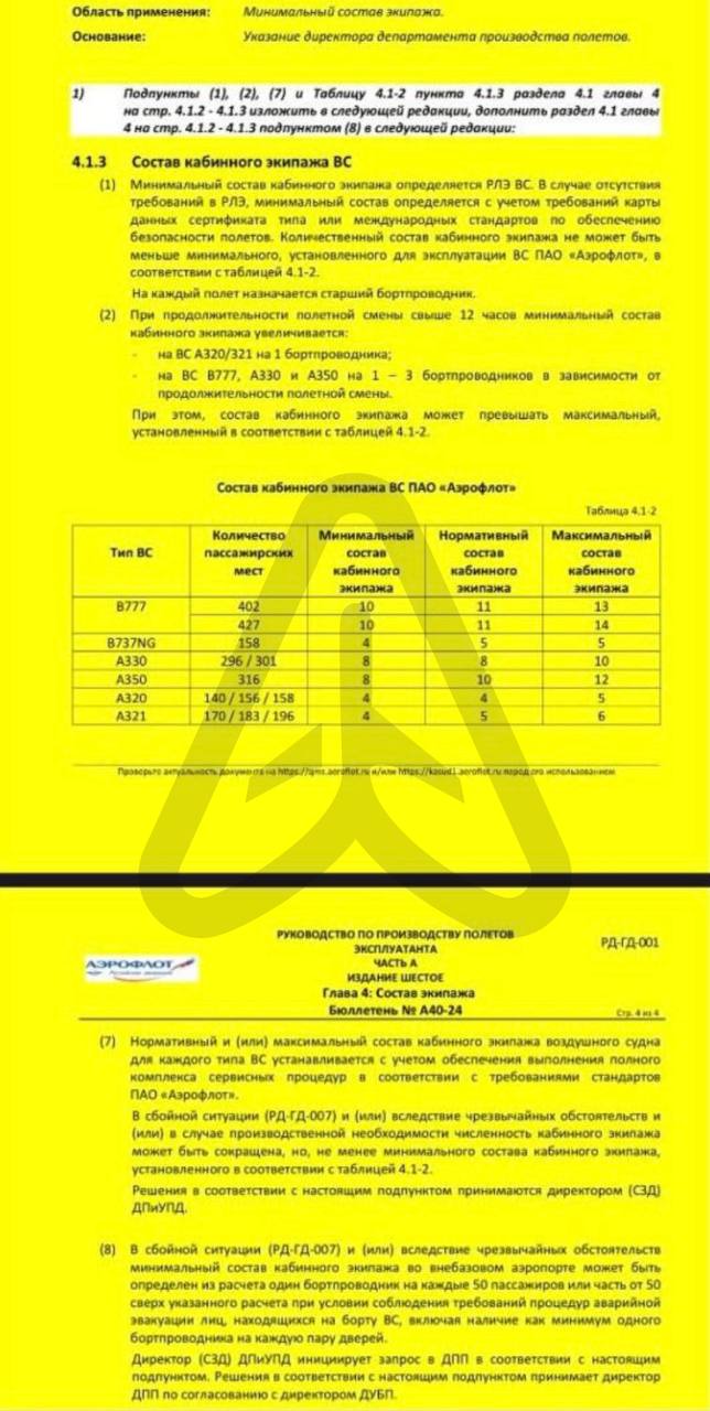Эти нововведения были внесены в руководство по производству полетов (РПП) после предостережения Госавианадзора, который вскрыл в «Аэрофлоте» факты полетов с сокращенными экипажами меньше минимальной численности в нарушение РПП.