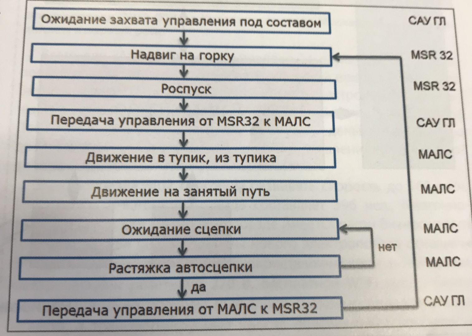 После фиксации сцепки МАЛС снимает с себя управление локомотивом , а MSR-32 после построения диспетчером машрута надвига состава на сортировочную горку принимает на себя управление. Далее надвиг и роспуск происходят под управлением системы MSR-32, которая снимает признак готовности к управлению по окончанию роспуска , когда последний вагон проследует горочный светофор и локомотив остановится .