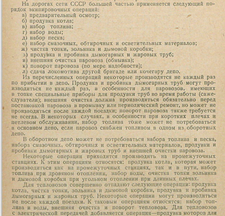 Это вот из книги Штанге об организации локомотивного хозяйства. Стр.114. А ещё надо очищать дымовую коробку и ещё и чистить топку от шлака каждые 75-250 км . Очищать трубы специальными продувальщиками и пробивальщиками труб. Ах да! Нужно ещё и воду для котла специально приготовить . Жесткую или соленую воду заливать нельзя. Или хотя бы смягчить . Ещё и продувка котлов, холодная или горячая промывка .... там чтобы все это хозяйство организовать требуется много угля, много воды (горячей , тёплой и холодной ) и много рабочей силы. Отдельное стационарное паровое хозяйство с сетью паропроводов. Тем более, паровоз не машина, его выключить нельзя ....