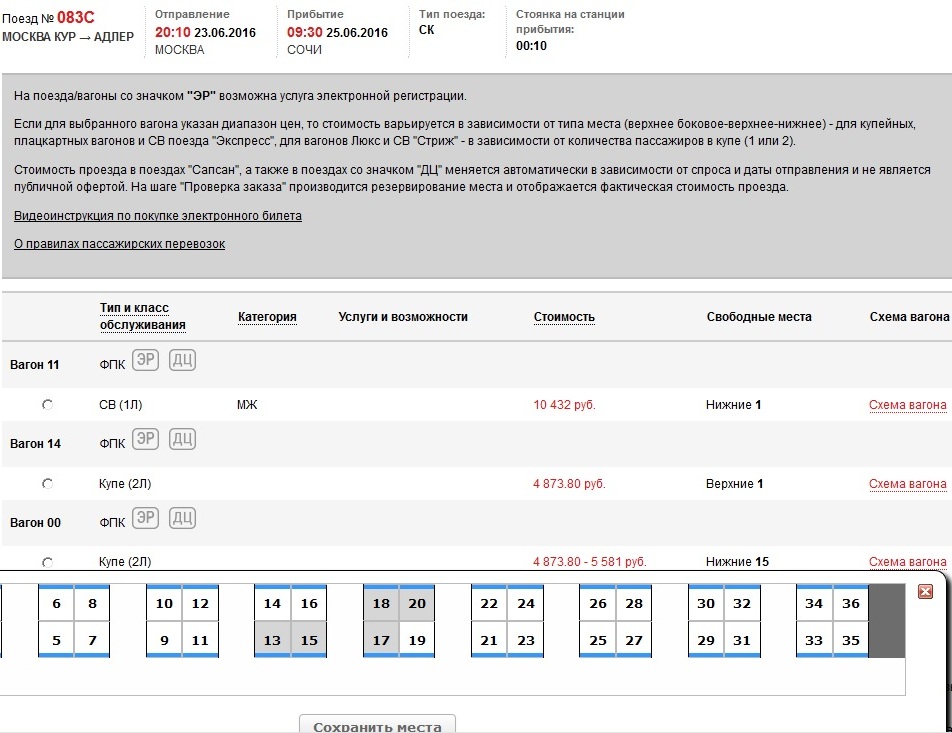 Во втором вагоне продано место 38 ( стоимостью 1375,90), в 3-м оно свободно.А чем объяснить разную стоимость верхних полок плацкарта, оба 3Л от ФПК?