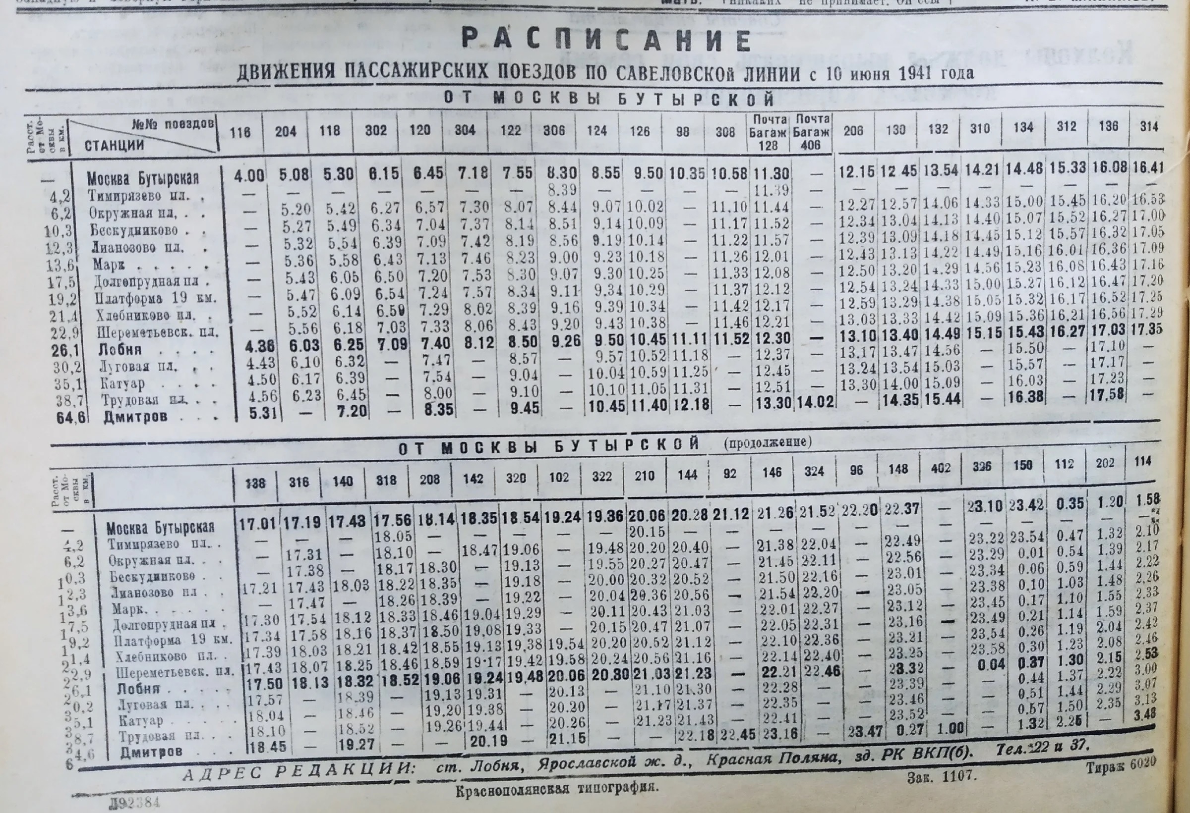 Расписание поездов Савёловского направления. Лето 1941 года.