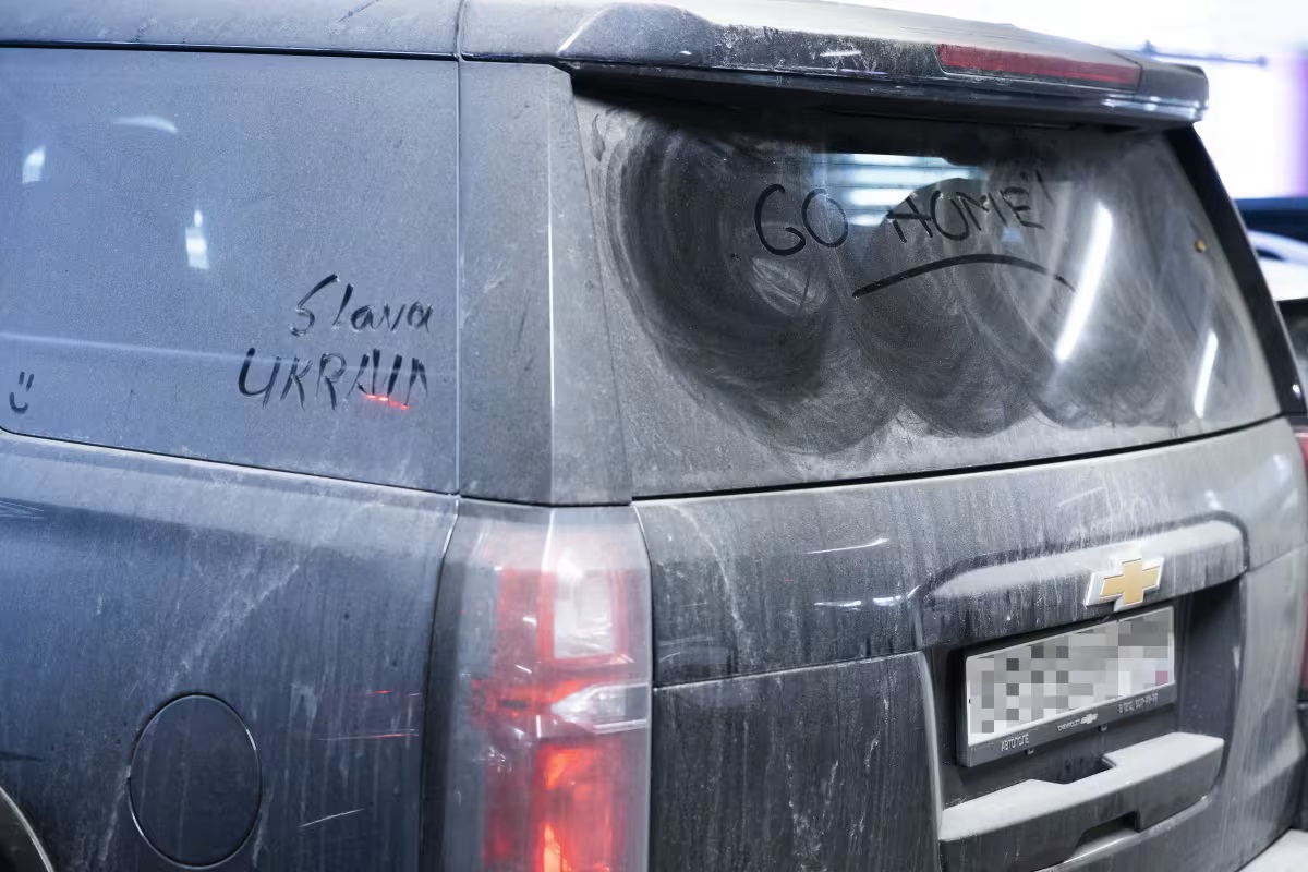 Некоторые из них, судя по слою пыли, ждут своих владельцев уже несколько месяцев. На толстом слое пыли заднего стекла Chevrolet из России кто-то даже написал ”Go home” и ”Slava Ukraini”.