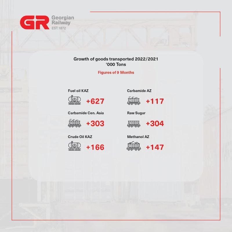 Объем грузоперевозок по сети Грузинских железных дорог за 9 месяцев 2022 составил 99 млн тонн, что на 22% больше, чем за аналогичный период прошлого года. За последние пять лет – т.е. по сравнению с аналогичным периодом 2018 – грузооборот вырос на 40%.