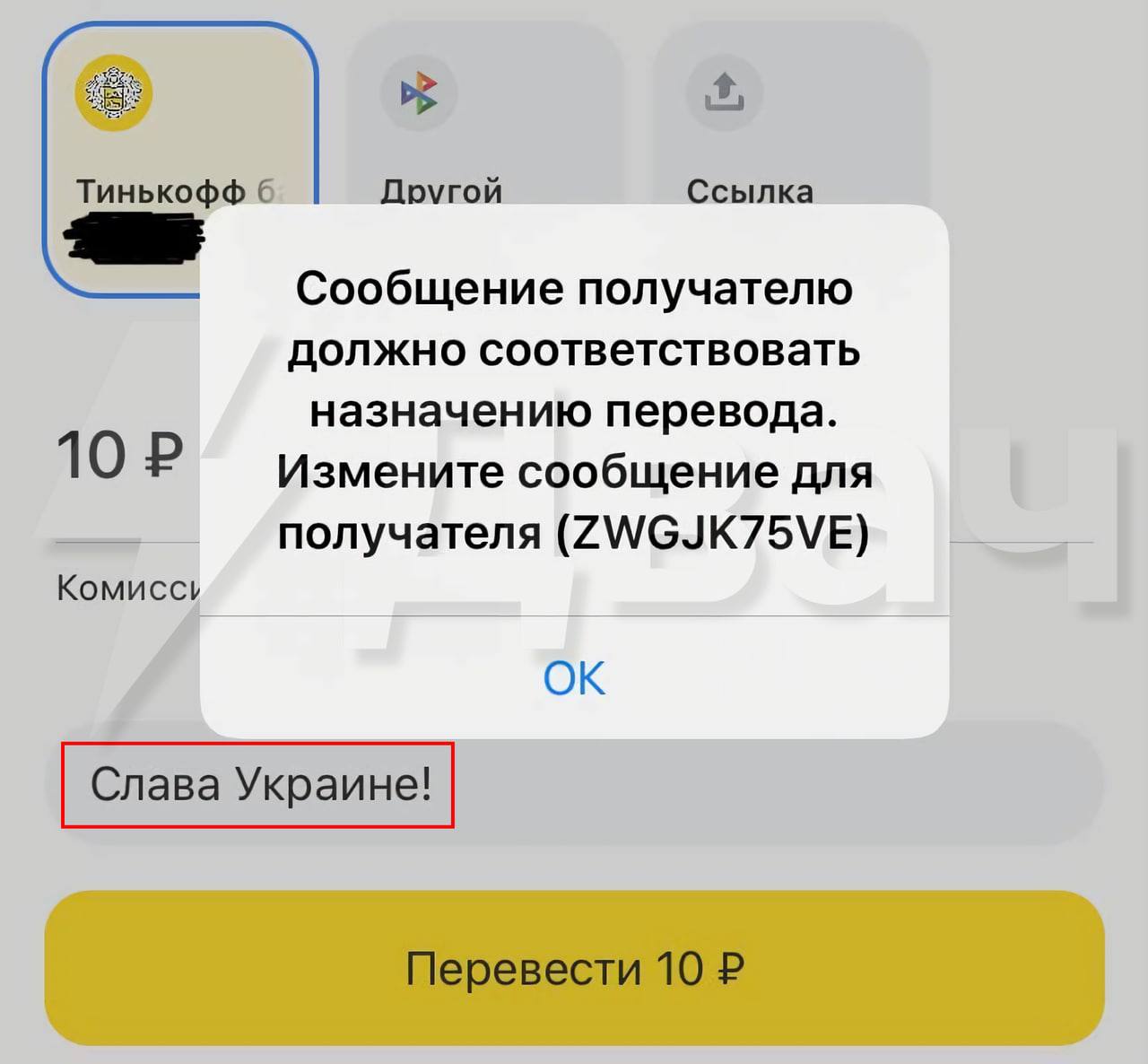 Тинькофф Банк запретил переводы с комментариями, связанными с Украиной