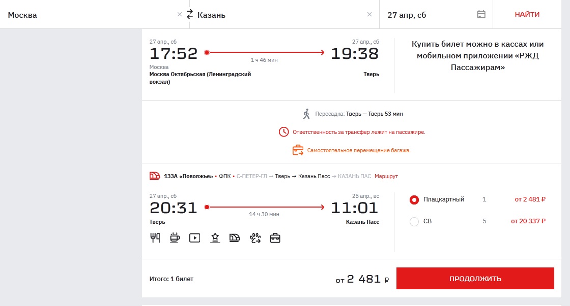 Например, при запросе мест на маршрут Москва-Саратов на 27 апреля предлагается выбрать следующий вариант -