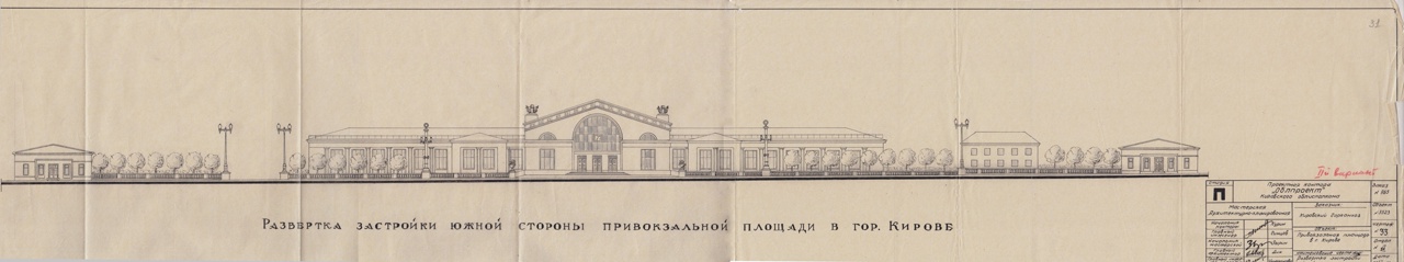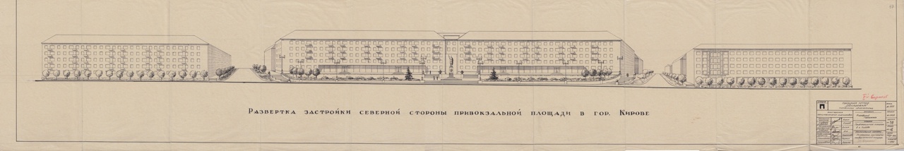 25 августа 1959 г. исполкомом Кировского горсовета принято решение о строительстве вокзальной площади станции Киров (в настоящее время - Привокзальная площадь). В соответствии с этим решением "Кировоблпроекту" было поручено составить проектную документацию по планировке и застройке площади. В частности, проект должен был предусматривать застройку Привокзальной площади и прилегающих к ней кварталов. Застройка должна была вестись типовыми пятиэтажными домами со встроенными торговыми и бытовыми помещениями. Также проект должен был предусматривать организацию автотранспортного движения на площади. Кроме того, при проектировании благоустройства должно было быть предусмотрено озеленение улиц, площади, асфальтирование площади и улиц, внутриквартальных переходов, оборудование стоянок и остановок для автотранспорта. В соответствии с этим поручением в положенный срок "Кировоблпроект" подготовил проекты застройки Привокзальной площади. Конечно, реальность снова внесла свои поправки, и застройка была произведена не совсем по проекту.