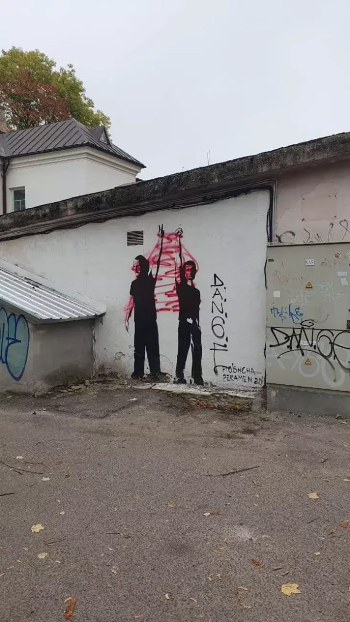 Инцидент произошел сегодня ночью. Также вандалы повредили мурал рядом с зданием — изображение диджеев с минской «Площади Перемен» 2020 года.