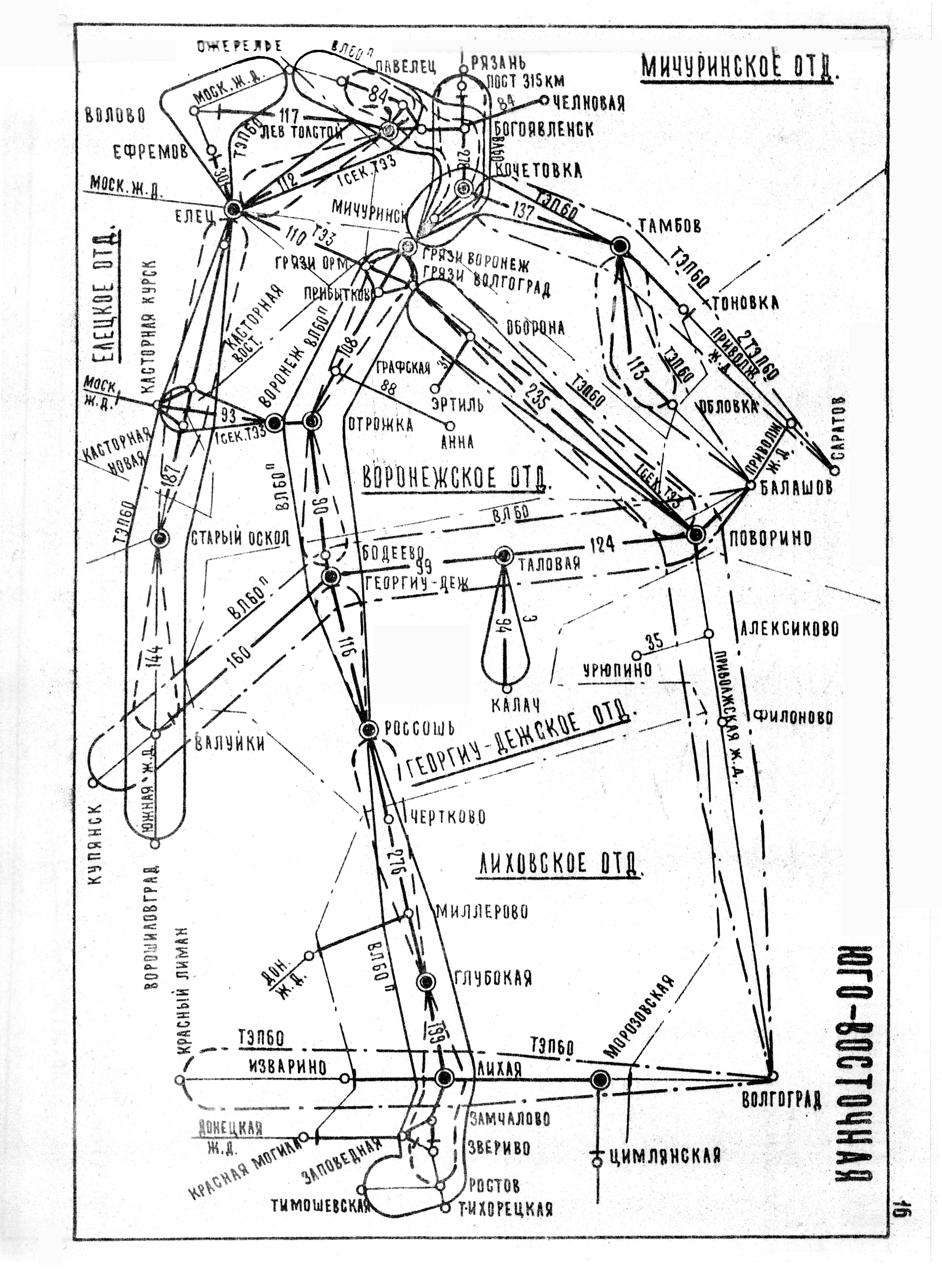 Судя по тому, что нет ЧС4 и ЧС4т, а также потому, что Лиховское отделение еще в составе ЮВЖД, это не позднее середины 70-х. ТЭ3 еще имеются от Воронежа до Касторки и от Таловой до Калача.Эта схема 1976 года. Их ЕвРо выкладывал. Есть по всем дорогам кроме Горьковской. Горьковской нет, потому что тот кто сканировал альбом два раза сосканировал Северную.