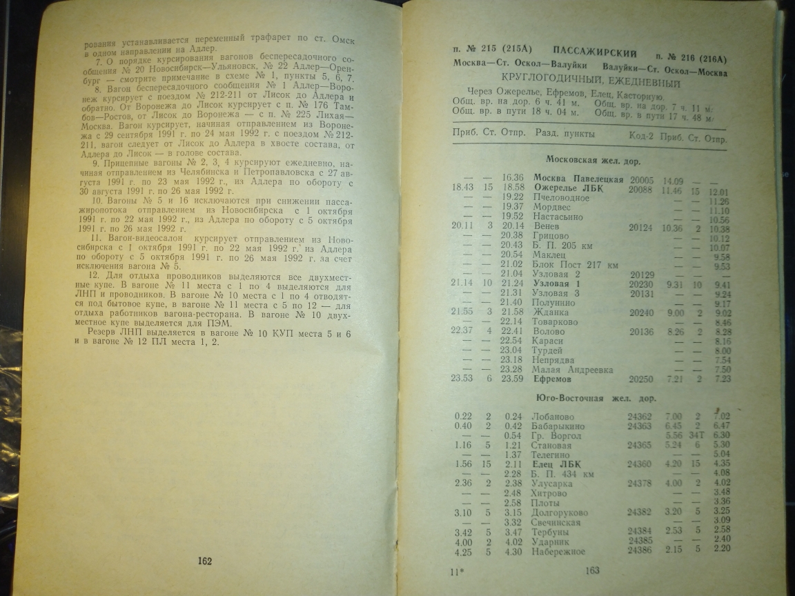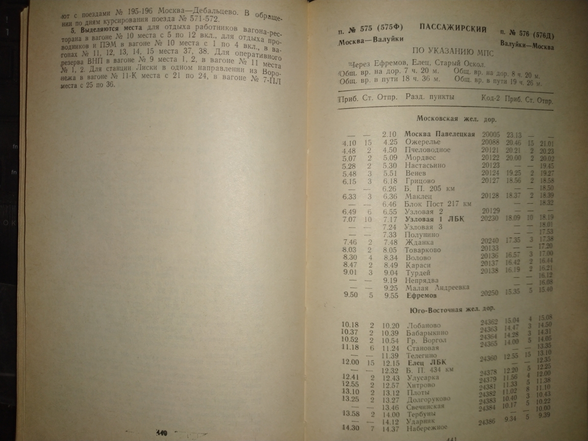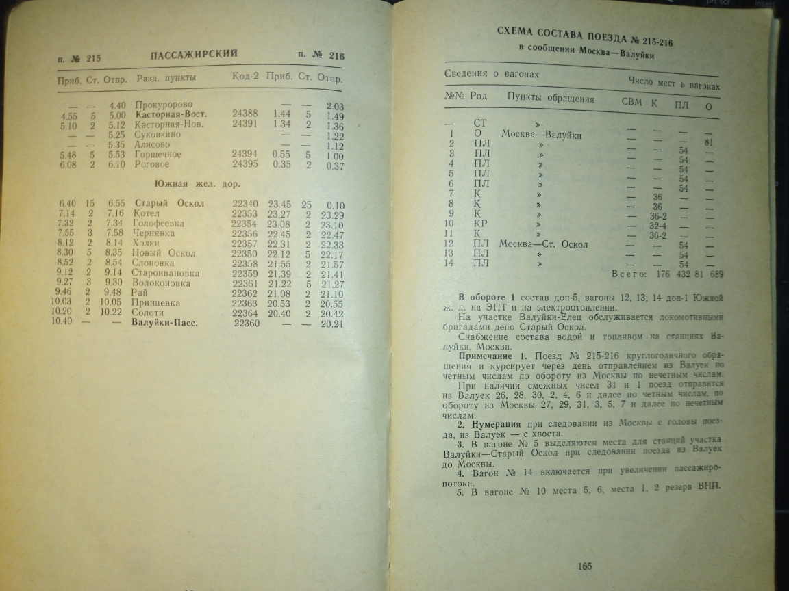За 1988 год в книге вообще ничего не сходится. Там, к примеру, поезд 237 от Горшечного до С.Оскола время 1 час пути висит, зато по участку Купянск-Сватово отрицательное время, т.е. прибывает в Сватово в 17.21, отправляется в 17.09)). По служебке Донецкой прибывает в 17.03, но в по Купянску у него время 16.02-16.19.