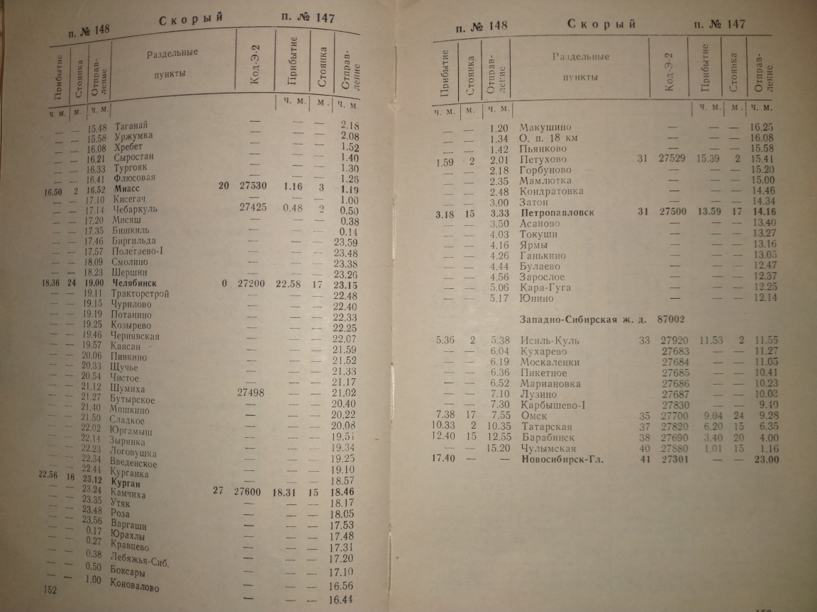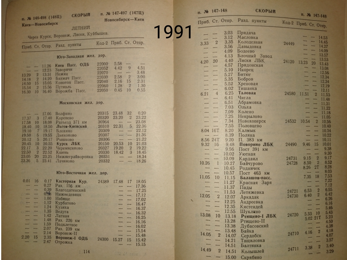 147/148 Киев-Новосибирск 1991Kuryanin: Может у кого-нибудь есть служебное расписание 147/148 Киев - Новосибирск и 357/358 Киев - Свердловск от Воронежа до Касторной?