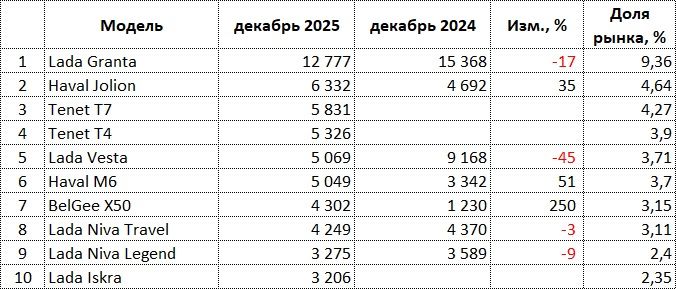 В декабре 2025 года в России продано 136 463 новых автомобиля, что на 10,6% больше, чем в декабре годом ранее.
