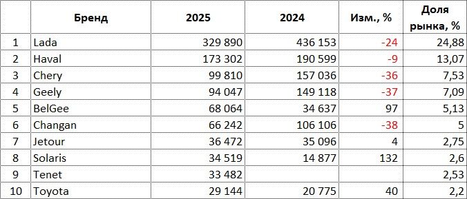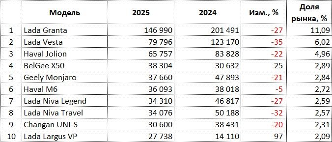 В 2025 году в России было продано 1 326 016 новых легковых машин, что на 15,6% меньше, чем в 2024 году.