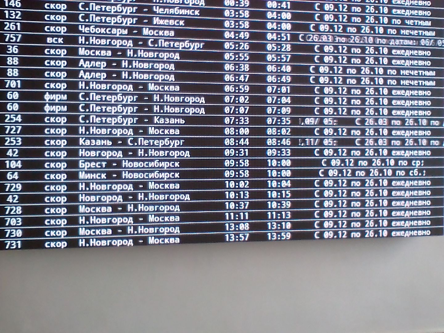 На вокзале Дзержинска внедрили новую систему информирования для пассажиров. На платформах установили электронные табло о прибытии/отправлении поездов. Ну и на вокзале обычное расписание поездов заменили на электронное. Очень информативное. Имеем по 2 поезда 88, 60, 42 с одними и теми же днями курсирования, но разным временем прибытия/отправления. Ну и разница между скоростным и скорым тоже видна невооруженным глазом.