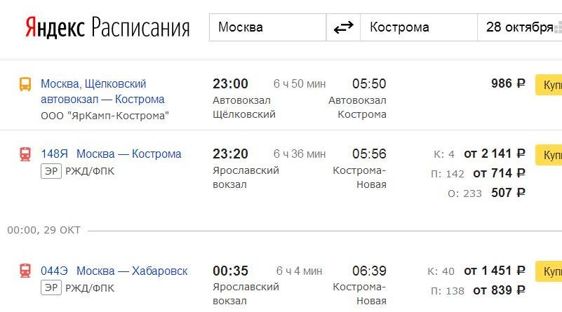 Цена билета из Москвы в Кострому составит — 980 рублей, для детей до 12 лет с предоставлением отдельного места (при предъявлении свидетельства о рождении) — 490 рублей. Стоимость багажа — 50 рублей.
