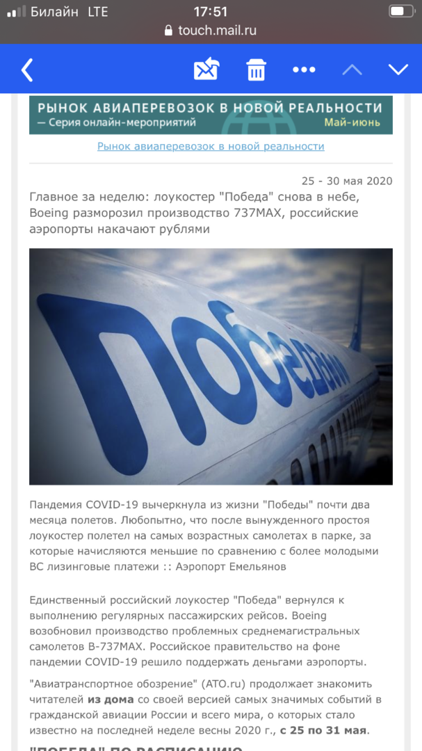 Ради интереса посмотрел про Победу - информация не соответствует действительности, совершенно произвольный набор самолётов летает, и новые, и старые, всех собственников. Откуда вообще взялась эта информация, что летают только старые, не понятно. Набор то конечно не произвольный, уж не знаю из чего там исходили выбирая какой борт поднимать а какой нет, но точно не по возрасту. ::-X: