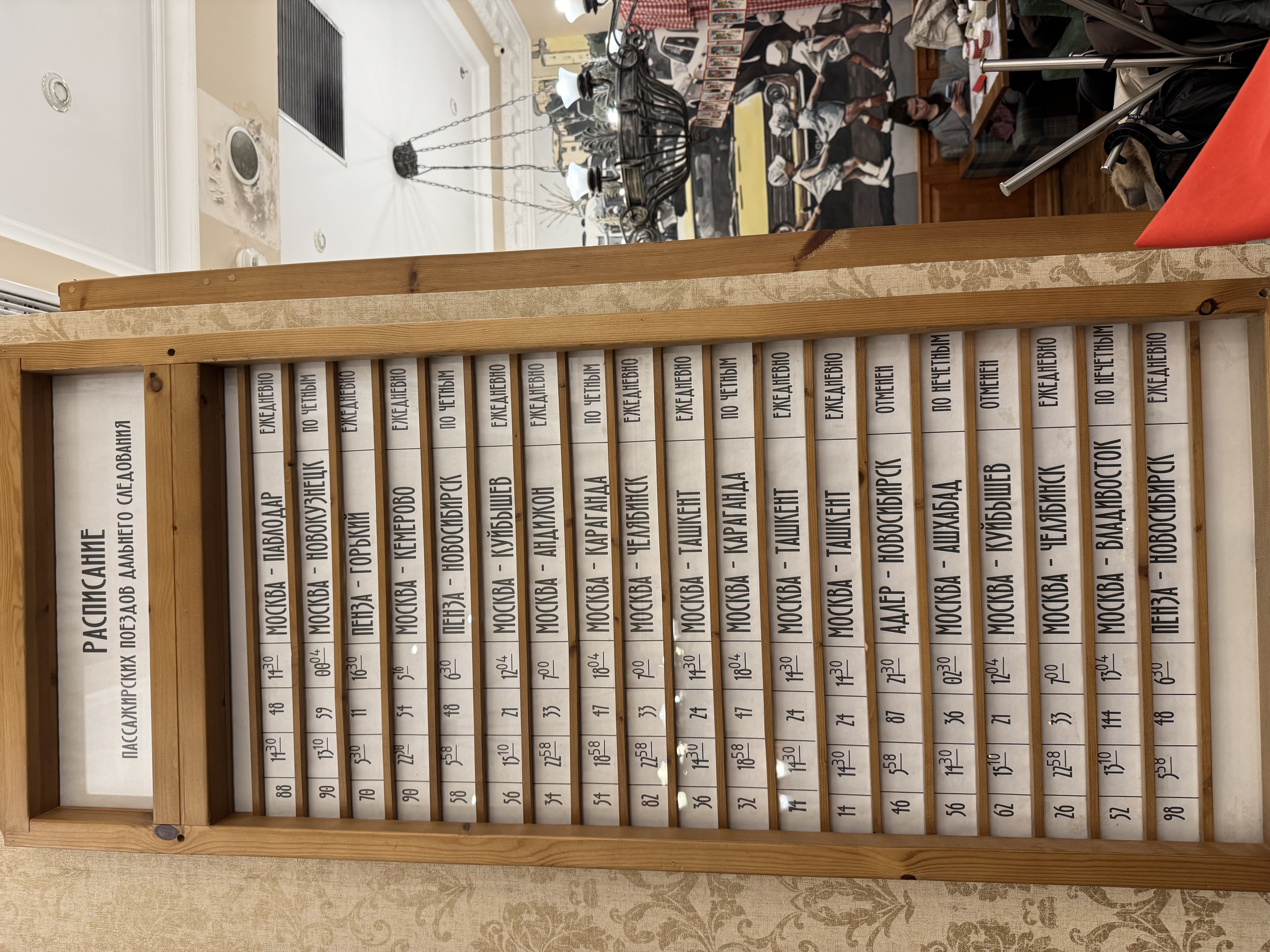 А год...не берусь и судить. Но раз там есть Москва-Ашхабад, который в атласе расписаний 1977 года ездил маршрутом через Рузаевку, как и Андижан, то остановлюсь на 1977-1978 годах..!Интересно, оно настоящее или вымышленное под интерьер?v_gildenberg: Культовая станция Рузаевка...А год...не берусь и судить. Но раз там есть Москва-Ашхабад, который в атласе расписаний 1977 года ездил маршрутом через Рузаевку, как и Андижан, то остановлюсь на 1977-1978 годах..!