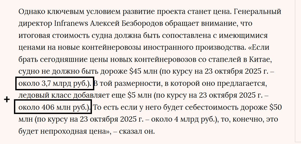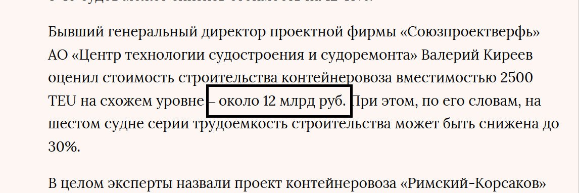 Алексей говорит - контейнеровоз от 2,5 до 3 тыс. TEU стоит новый на рынке с ледовым классом +/- 4,1 млрд.руб., Все остальные называют цену от 12 млрд. Внимание - от $200 млн (это цена огромного, в 6 раз большего и в 10 раз более технологичного чем контейнеровоз СПГ-танкера).
