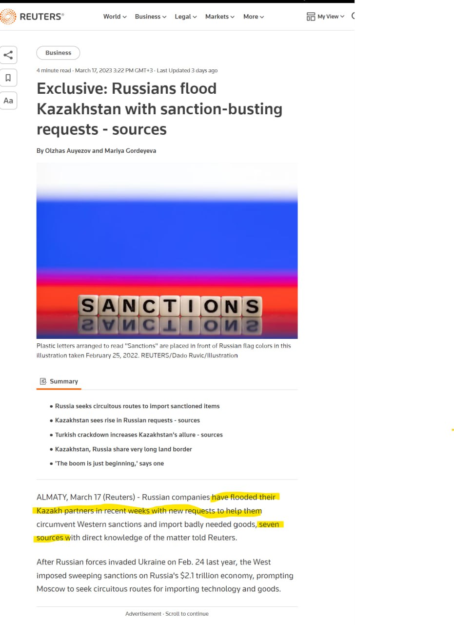 В этом материале про Казахстан - 7 (семь) анонимных источников подтверждают, что русские завалили казахов запросами на поставку товаров в обход санкций. Мы понимаем, что Рейтеру надо фонтанировать фантазиями. Но тут "профессионализм" подвел. Если бы написали, что русские завалили заявками узбеков или киргизов, азербайджанцев, или еще кого - можно было бы поразмышлять про логику. Но по Казахстану давно никто надежд не питает. Казахстанские политики крайне жестко дистанцируются от такого посредничества, и не поддерживают свой бизнес в этом. Так что, никто казахов ни о чем не просит. И уже не попросит :8-):