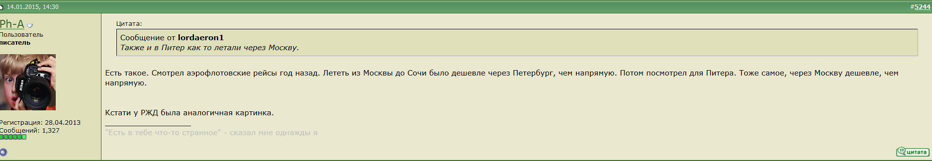 Slon » 20-01-2015, 23:58:Самолет Москва - Ленинград - Сочи дешевле, чем Москва - Сочи, причем у одной и той же а/к, причем со сквозным билетом.