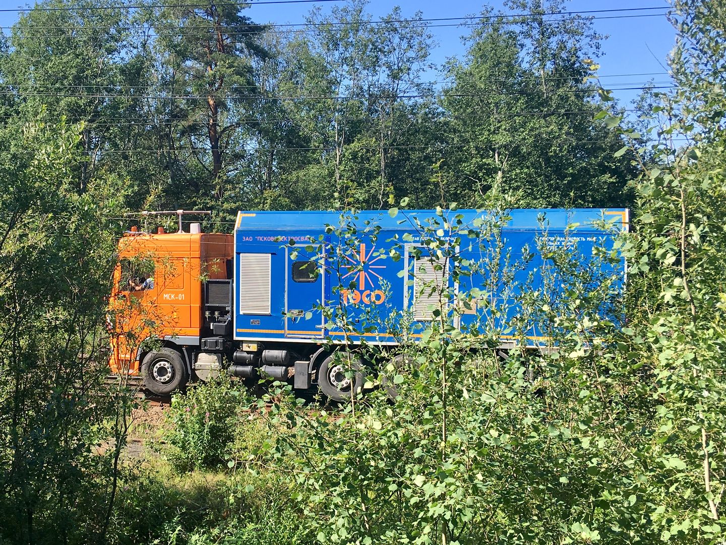 Вроде бы это рельсосварочный агрегат, хотя вблизи его еще не видел. Шасси голландский DAF (если я правильно разглядел издалека лого). Катается по участку как к себе домой. :) Представляю офигение водил на переездах, когда оказывалось, что они ждали вот его.