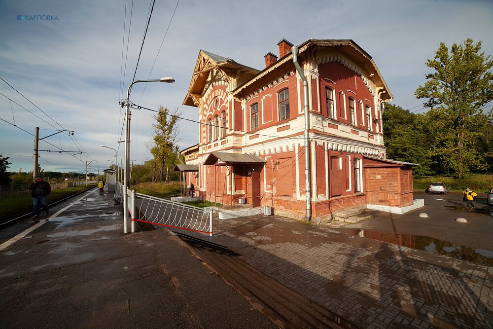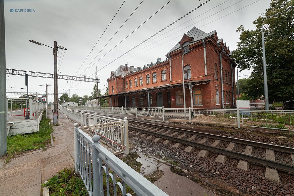 Вокзал ст. Стрельна, построенный в 1857 г. по проекту Н.Бенуа, пострадал во время войны и был восстановлен в 50-е годы ХХ в. От станции можно дойти до Константиновского парка и дворца.