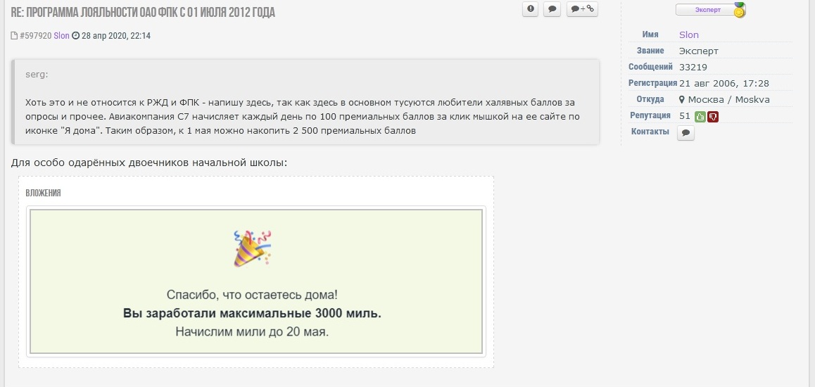 А посему, Slon поделитесь опытом, как Вам, будучи Хозяином жизни, как Вы себя здесь позиционируете на форуме - удалось каждый день заходить на сайт и кликать мышкой ради 100 баллов? Вы ставили себе будильник или напоминание? Или просто целью каждого прожитого дня в этот период было получить заветные 100 баллов от авиакомпании С7?
