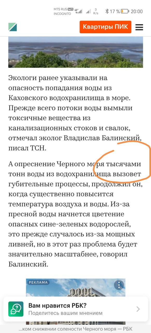 Непроходимые, необразованные идиоты. :]:-O: Кубатура Чёрного моря почти 550 тысяч куб километров, Кубатура Каховского водохранилища 18 кубических километров. Чтоб соленость Чёрного моря в три раза упала (даже с учётом сложностей с обменом воды ниже 200 метров глубины) надо влить туда хотя-бы 1 к 5 к воде. А влилось 1 к 30 000.