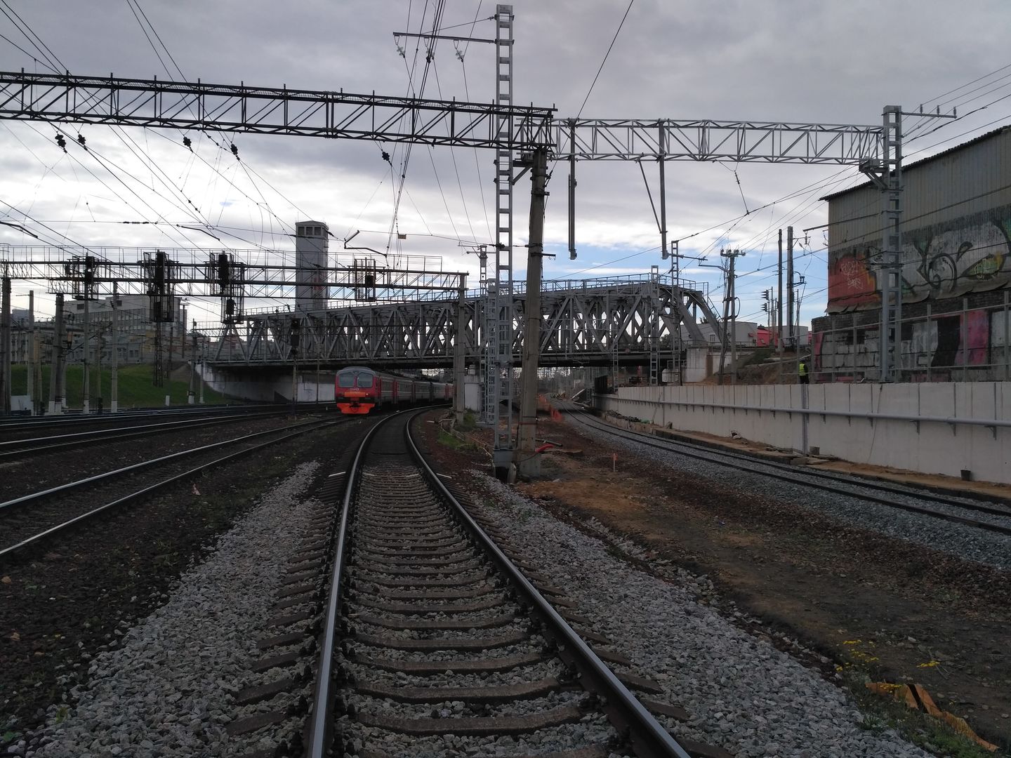 Два пути справа (3 и 4 главные пути Ленинградки). Крайний путь передвинули к новой подпорной стене. Потом передвинут и второй путь. Делается это для того что-бы всунуть под путепровод Митьковской ветви строящийся 5-й главный путь Ярославки.
