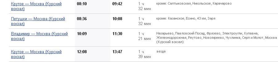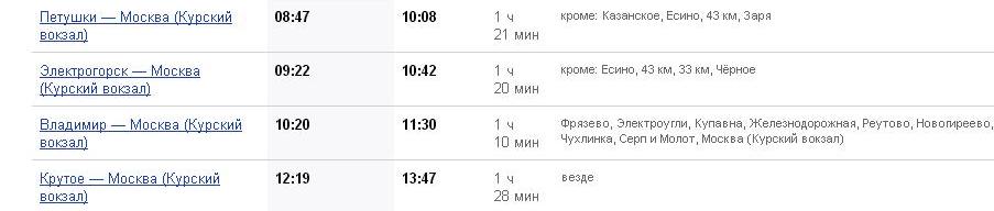 Только из Кусково во Владимир сейчас нет останавливающихся прямо в Кусково (без необходимости пересадки), а вот обратно сразу две штуки!