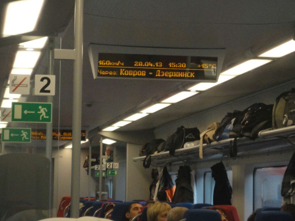 Перед отправление, как и в Сапсане, машинист произнес приветствие на русском и английском языках, затем было обЪявлено о высадке по станциям Ковров и Дзержинск высадка будет производиться из вагонов 2, 4, 7, 9. Во Владимире высадка из нашего 1-го вагона была через 2-й вагон, перед прибытием об этом нас предупредил проводник.