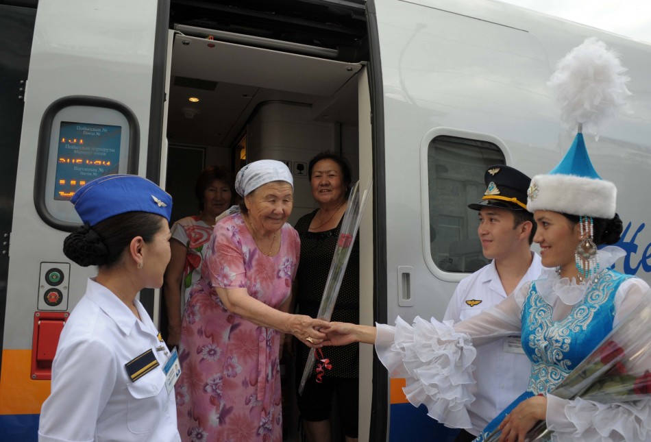 Внешний вид: серо-синий поезд, состоящий из множества маленьких низеньких вагончиков. В самом начале и в конце состава расположены технические вагоны (вагон-электростанция и другие). Нумерация Алма-Ата последний-первый Петропавловск. На участке Кокшетау-1 - Петропавловск поезд тащит новейший суперскоростной локомотив 2ТЭ10УТ-0023. Дальше - уже реально новый казахский электровоз. Посадка осуществляется через вагон (у меня через 20 вагон осуществлялась посадка сразу в 21 и 20). Двери автоматические, открываются кнопками. В поезде по два проводника на два вагона. Возможность есть сесть только с низкой платформы.