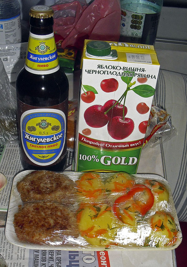 Этот набор продуктов был куплен на ст. Россошь. Варенная картошка, котлеты, соленые огурцы, пиво, сок.