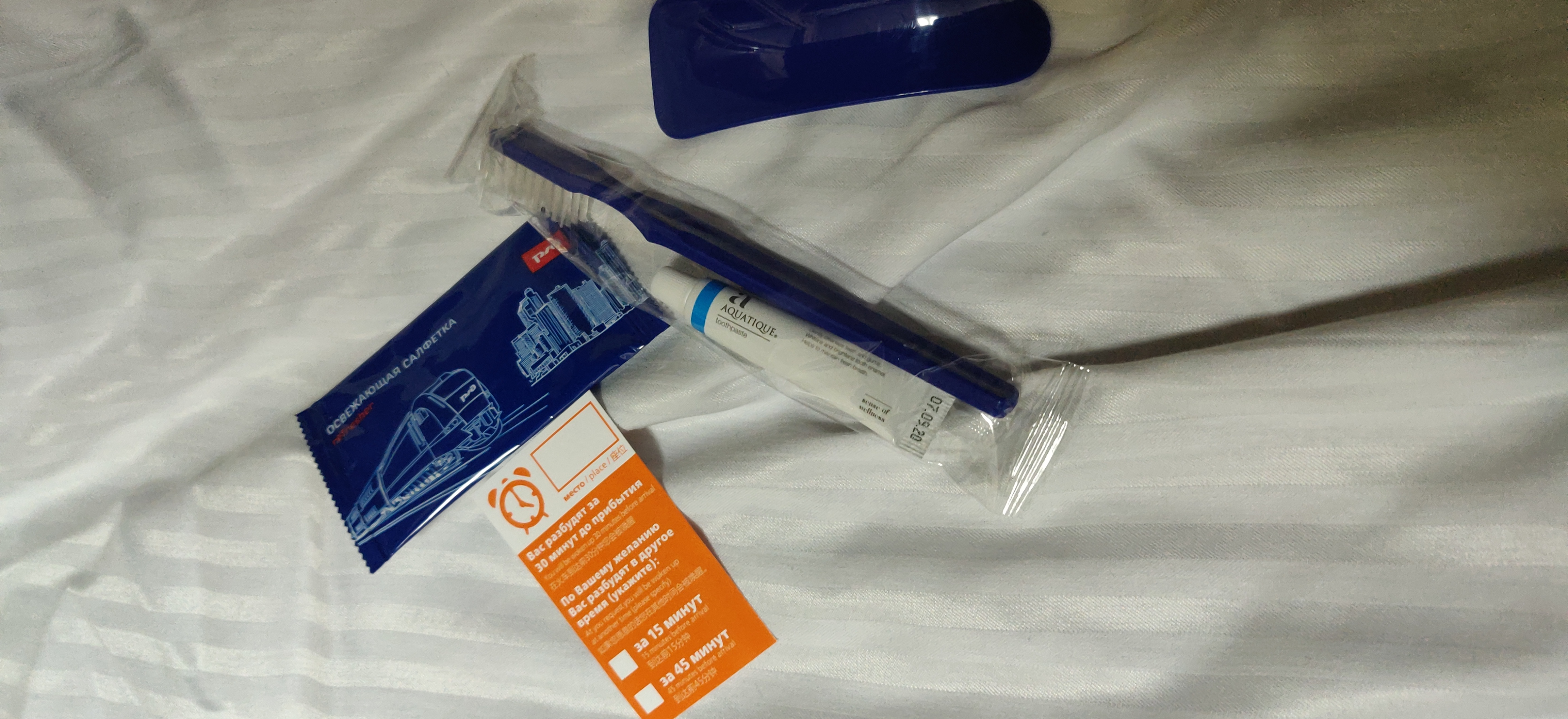 Оснащенность вагона: Здесь всё стандартно для фирменных РЖД: постель застелена, тапочки есть, также в дополнение к набору питания (о нём - чуть ниже) имеется гигиенический комплект зубная паста + щётка, что очень здорово. Ложка для обуви - как всегда на выброс. Макулатура в виде бизнес-газет - присутствует.